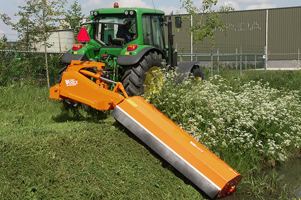 The side flail mower with the same qualities as the Jumbo, only more versatile because of a rotatable frame. By rotating the main frame, you are able to adjust the height of the hinge point of the mowing head. This makes it possible to mow shallow ditches and higher located lawns. Two hydraulic accumulators bring about a smoothly functioning hydraulic system.